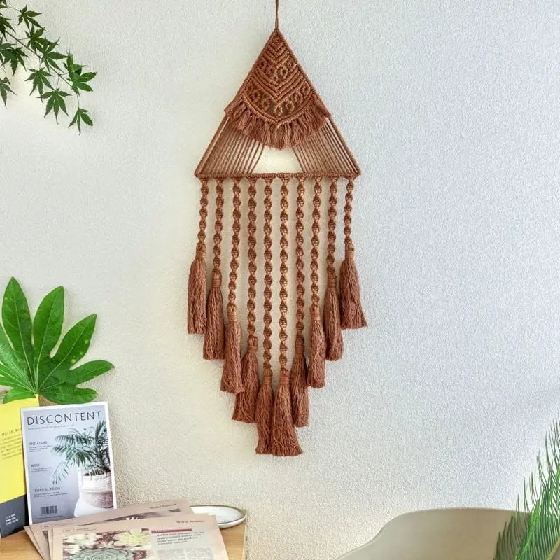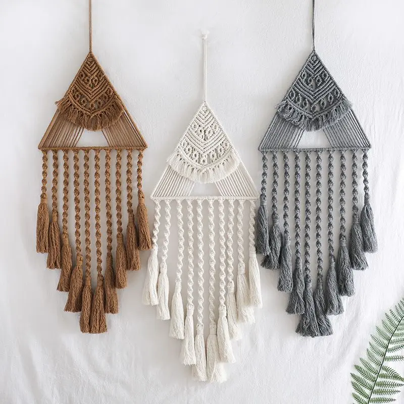 Elevate your home with our stunning bohemian triangular dreamcatcher pendant, a mesmerizing fusion of traditional craftsmanship and contemporary design. This bohemian style ornament combines the timeless appeal of hand-woven tapestry home decor with modern geometric aesthetics. Each unique piece is meticulously crafted by skilled artisans, making it an exceptional addition to any room seeking bohemian charm and artistic sophistication.