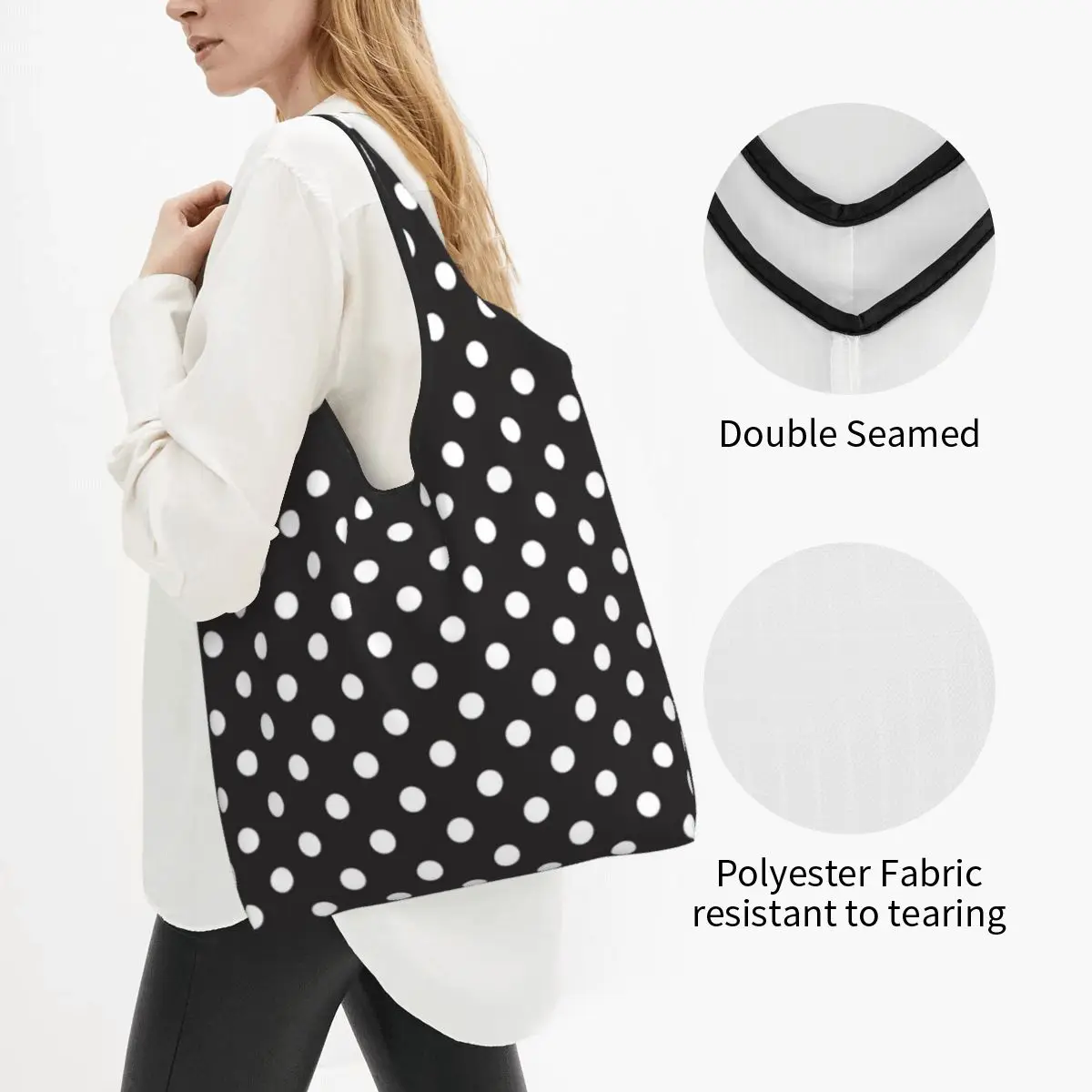 Embrace timeless elegance with this classic black and white polka dot tote bag! This versatile shopping companion combines vintage charm with modern sustainability, making it the perfect accessory for the style-conscious, eco-friendly shopper.