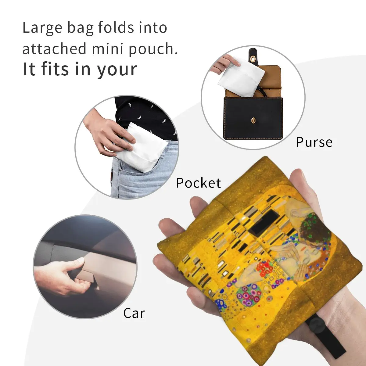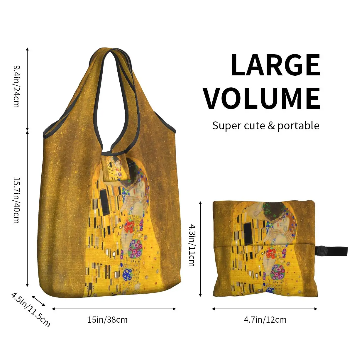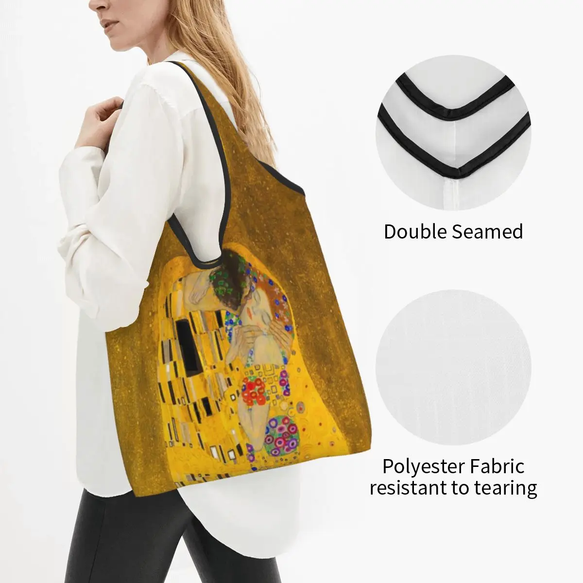 Carry a masterpiece with you everywhere! This stunning tote bag features Gustav Klimt’s iconic “The Kiss,” transforming your daily errands into an artistic experience.