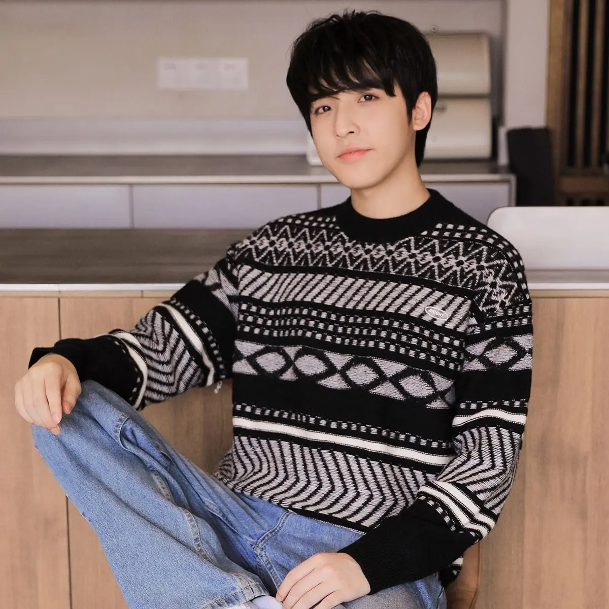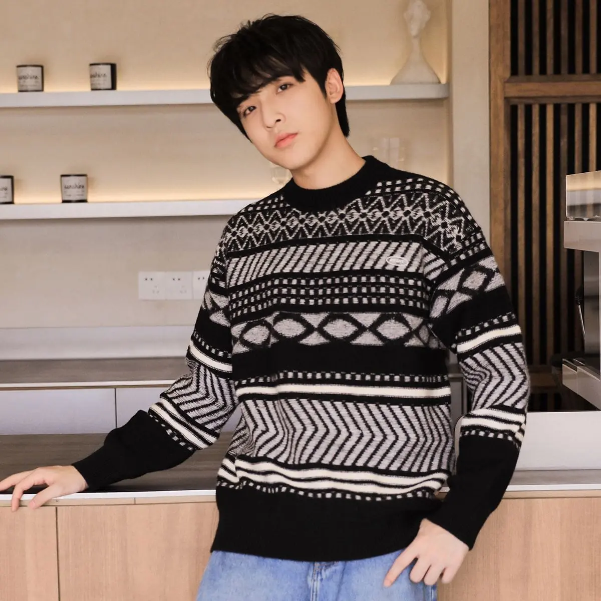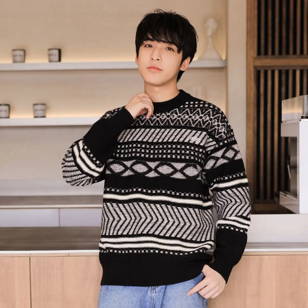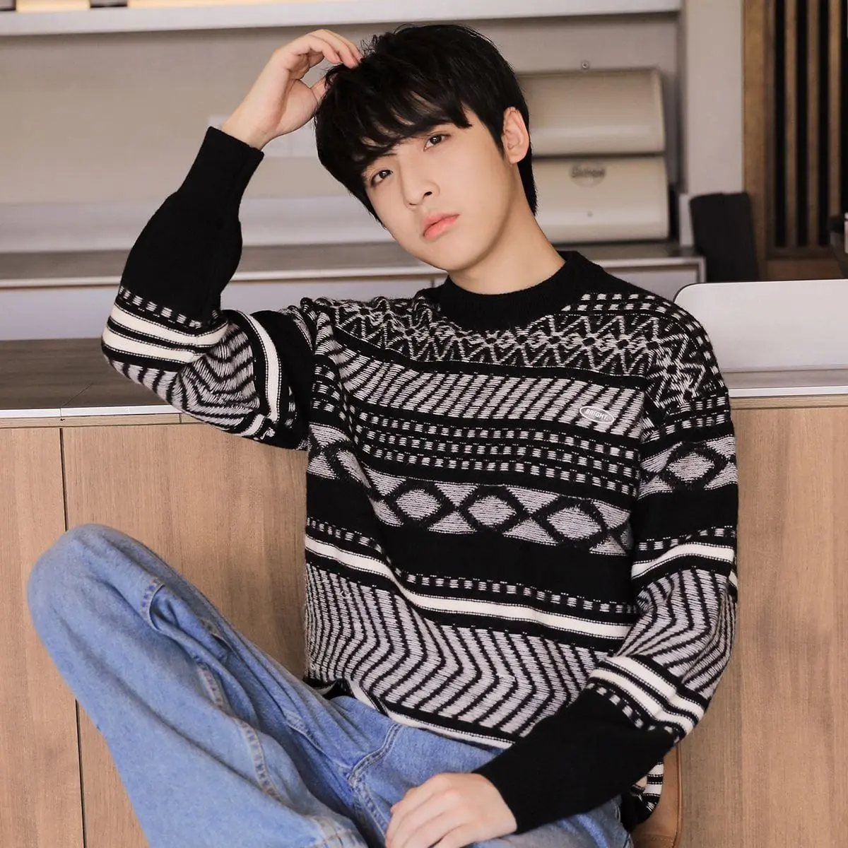 This geometric floral sweater features artistic all-over pattern on elegant black knit base. The relaxed lazy style prioritizes comfort while delivering striking contemporary visual appeal. Perfect for students seeking effortless winter warmth with distinctive artistic flair.