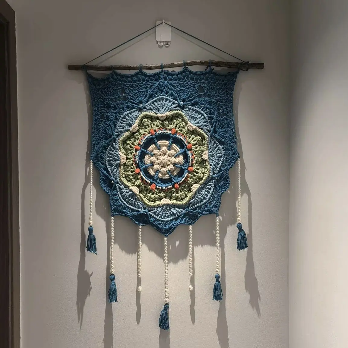 Bring sacred geometry and spiritual artistry with authentic hand-woven mandala tapestry featuring intricate geometric patterns. This finished ornament combines traditional weaving with mandala symbolism creating meditative focal points. Perfect for yoga studios, meditation rooms, and spiritual spaces seeking meaningful wall decoration honoring ancient traditions.