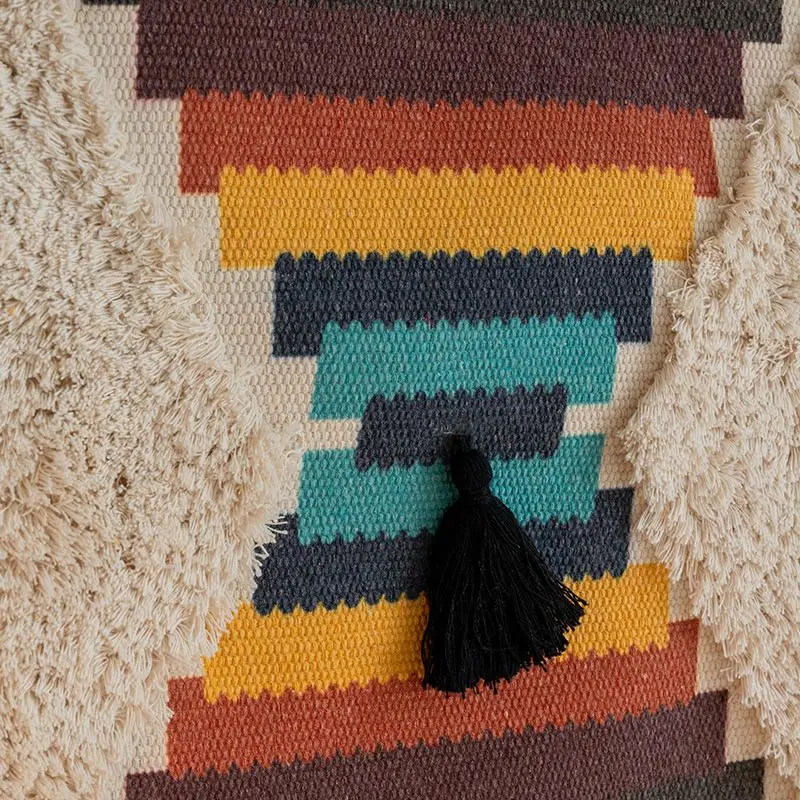 The color palette merges bohemian richness with Nordic sophistication. Jewel tones and earth hues are balanced with neutral anchors, creating visual interest without overwhelming. The geometric patterns reflect Nordic minimalism while organic color variations celebrate bohemian artistic freedom. This hand-woven wall fabric proves elegance thrives at the intersection of two design philosophies.