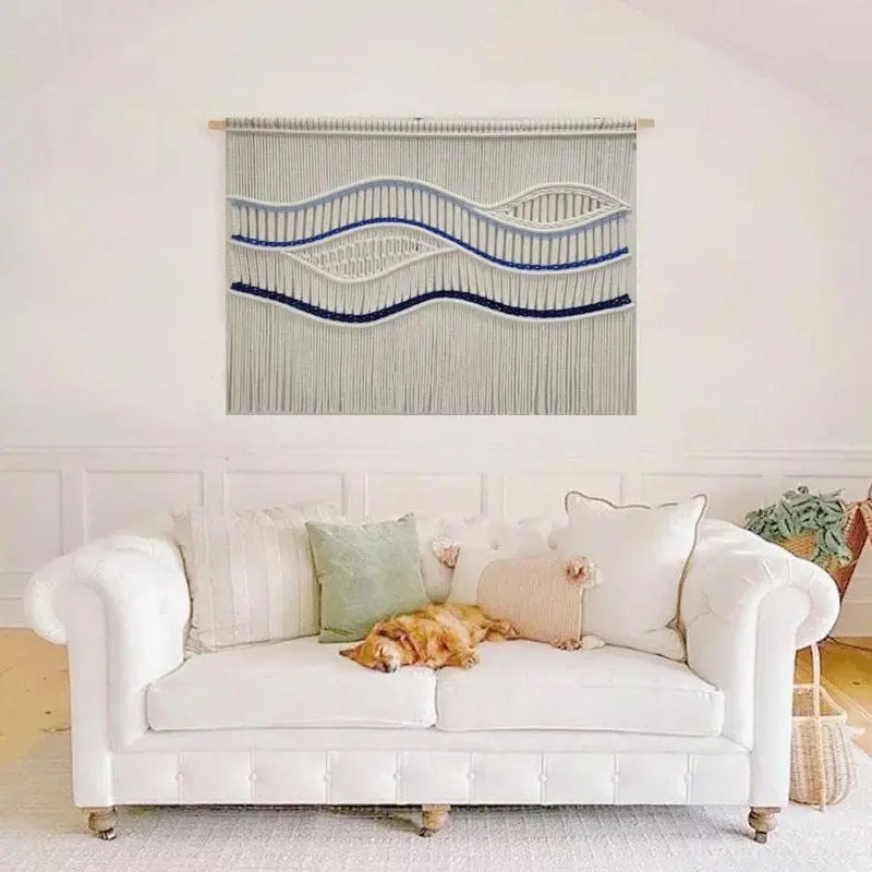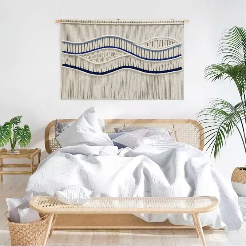 This handcrafted woven headboard combines traditional craftsmanship with Nordic minimalist design using sustainable natural fibers. Perfect for living rooms, bedrooms, hotels, and homestays, it functions as sofa backdrop or wall tapestry. The neutral geometric patterns and textured weaving create warm focal points with timeless Scandinavian elegance.