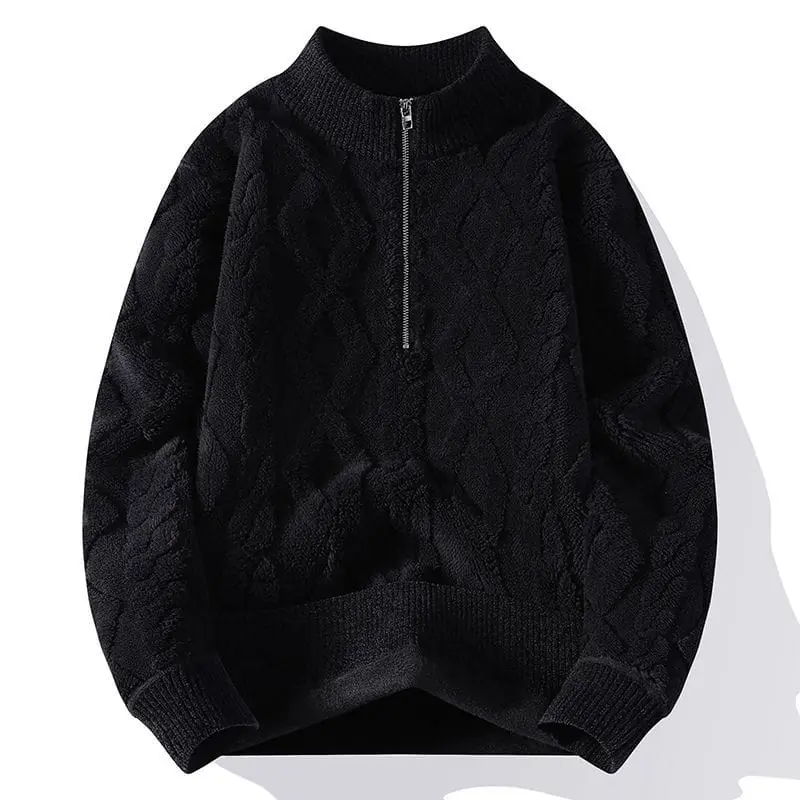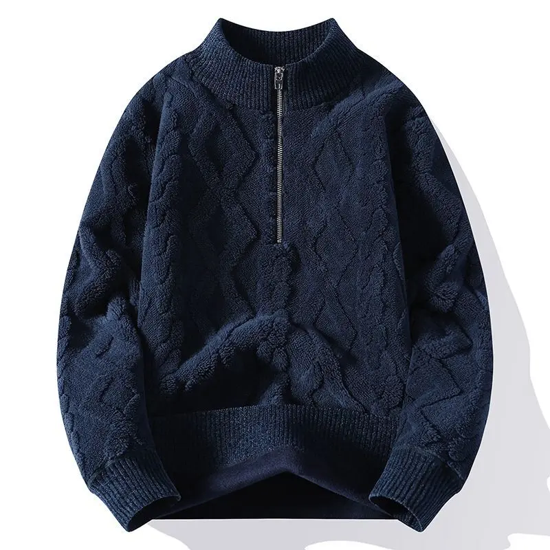 This high neck jacquard sweater features premium fleece lining delivering exceptional warmth and cozy comfort. The sophisticated jacquard pattern adds visual interest while half-zip design offers convenient temperature control. Perfect for autumn and winter with versatile loose-fitting casual style.