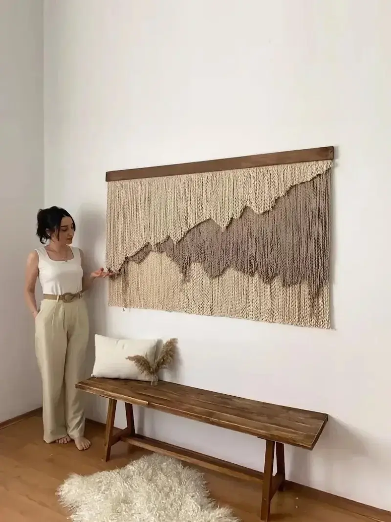 This handwoven tapestry celebrates natural materials and understated minimalist design. Clean aesthetic brings warmth and texture without overwhelming existing decor beautifully. Perfect for living rooms, bedrooms, or creating peaceful, sophisticated home ambiance.