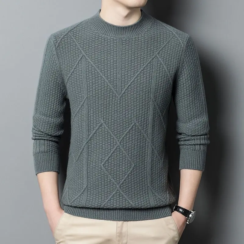This round neck jacquard sweater features elegant woven pattern with thickened construction for exceptional warmth. The flattering slimming design creates refined silhouette while accommodating mature body types gracefully and comfortably. Perfect for middle-aged men seeking sophisticated autumn and winter base layer with timeless appeal.