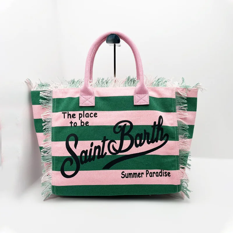 Experience European elegance meets American functionality with this stunning SAINT BARTH striped canvas tote. Featuring handcrafted details and sophisticated styling, this bag embodies the luxurious island lifestyle of Saint Barthélemy.